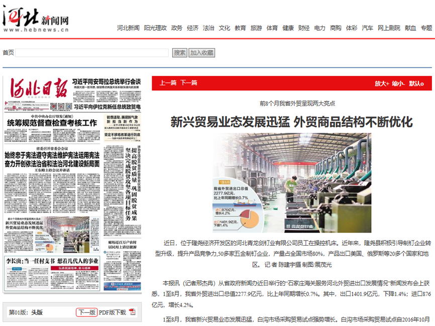 青龍劍釘業(yè)被《河北日?qǐng)?bào)》頭版報(bào)道!
