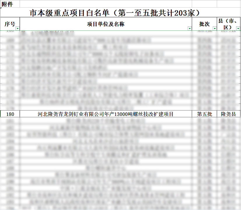 日前,邢臺市生態(tài)環(huán)境局網(wǎng)站公布了《邢臺市本級重點項目白名單企業(yè)》,青龍劍釘業(yè)作為“重點優(yōu)質(zhì)制造業(yè)”,《河北省重點產(chǎn)業(yè)鏈供應(yīng)鏈企業(yè)白名單》入選、22年動態(tài)調(diào)整列入《邢臺市生態(tài)環(huán)境監(jiān)管白名單企業(yè)》后,2023年第三次動態(tài)調(diào)整再次上榜!