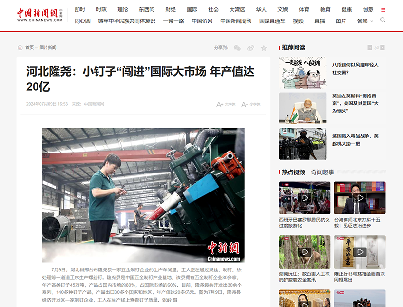 近日,中國(guó)新聞網(wǎng)記者走進(jìn)河北隆堯青龍劍釘業(yè)有限公司,對(duì)制釘車(chē)間的生產(chǎn)工序及車(chē)間環(huán)境進(jìn)行了解和拍攝。7月9日下午,青龍劍釘業(yè)榮登中國(guó)新聞網(wǎng)。