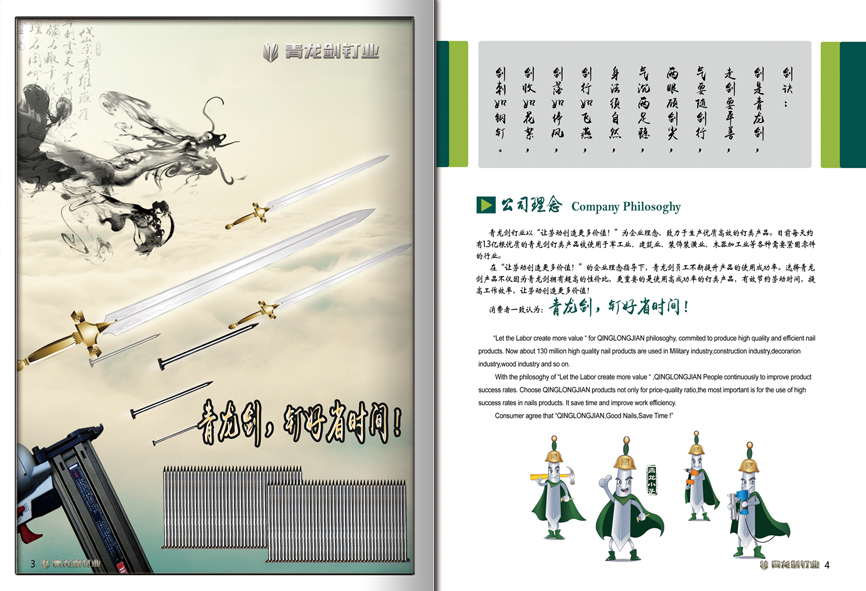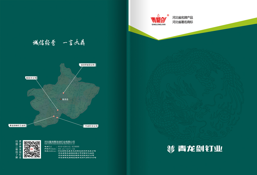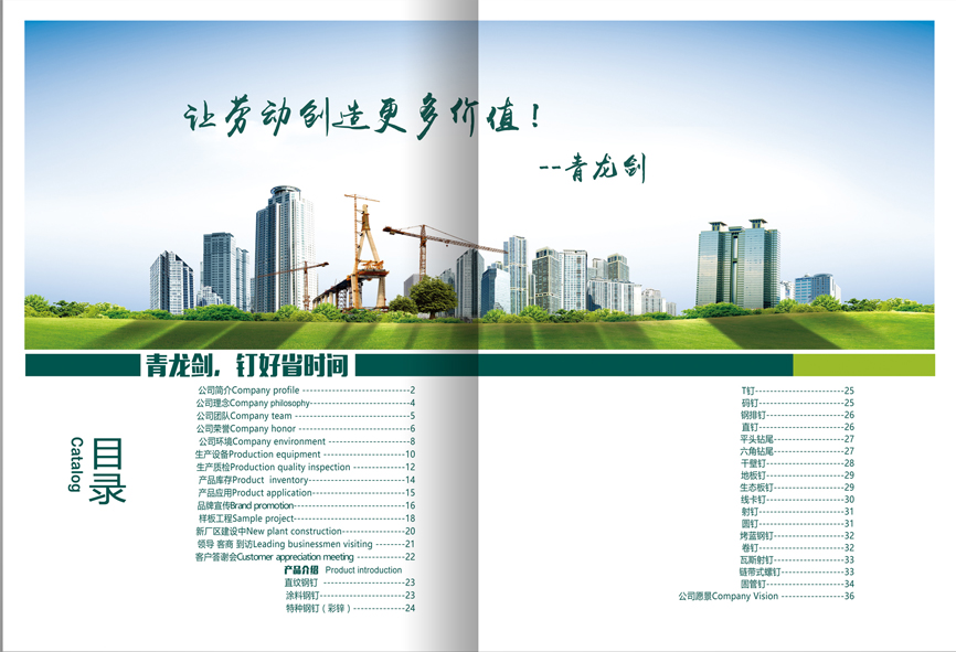青龍劍釘業(yè)以“讓勞動(dòng)創(chuàng)造更多價(jià)值!”為企業(yè)理念,致力于生產(chǎn)優(yōu)質(zhì)高效的釘類(lèi)產(chǎn)品。目前每天約有1.3億根優(yōu)質(zhì)的青龍劍釘類(lèi)產(chǎn)品被使用于軍工業(yè)、建筑業(yè)、裝飾裝潢業(yè)、木器加工業(yè)等各種需要緊固零件的行業(yè)。