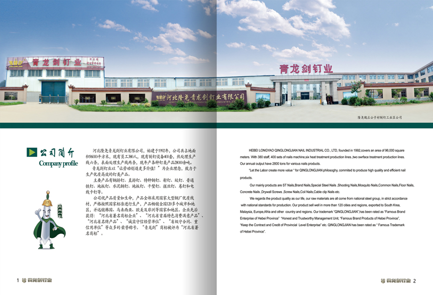 河北隆堯青龍劍釘業(yè)有限公司,始建于1992年,公司共占地面積96000平方米,現(xiàn)有員工380人,現(xiàn)有制釘設(shè)備400套,熱處理生產(chǎn)線六條,表面處理生產(chǎn)線兩條,現(xiàn)年產(chǎn)各種釘類(lèi)產(chǎn)品28000余噸。
