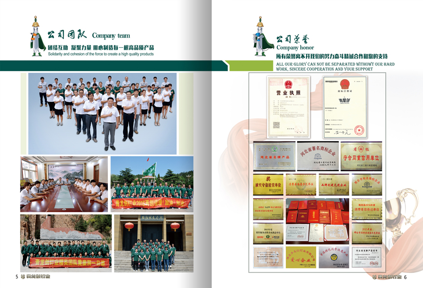 公司視產(chǎn)品質(zhì)量如生命,產(chǎn)品全部采用國(guó)家大型鋼廠優(yōu)質(zhì)線材,嚴(yán)格按照國(guó)家標(biāo)準(zhǔn)進(jìn)行生產(chǎn),產(chǎn)品暢銷(xiāo)全國(guó)120多個(gè)城市和地區(qū),并遠(yuǎn)銷(xiāo)韓國(guó)、馬來(lái)西亞、歐美及非洲等國(guó)家和地區(qū)。企業(yè)先后獲得:“河北省著名商標(biāo)企業(yè)”、“河北省首屆特色消費(fèi)滿意產(chǎn)品”、“河北省名牌產(chǎn)品”、“誠(chéng)實(shí)守信經(jīng)營(yíng)單位”、“省級(jí)守合同、重信用單位”等眾多的 榮譽(yù)稱號(hào)。“青龍劍”商標(biāo)被評(píng)為“河北省著名商標(biāo)”。