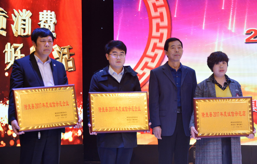 會(huì)上,發(fā)布了消費(fèi)警示,質(zhì)量抽檢通報(bào),并對(duì)群眾投訴名單進(jìn)行了曝光。隨后對(duì)誠(chéng)信經(jīng)營(yíng)企業(yè)做出表彰。期間播放了青龍劍釘業(yè)宣傳片,并為企業(yè)頒發(fā)了“隆堯縣2017年度誠(chéng)信示范企業(yè)”獎(jiǎng)牌。